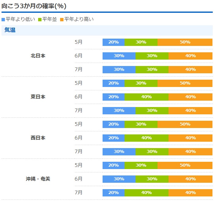 ただし、今年の3か月予報では、上記のとおり、平年よりも気温が高いという確率がそれなりにありますので、平年よりも暑さを感じられる時期が早いかもしれません。